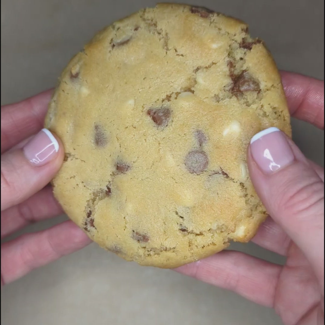 Flour (WHEAT), milk chocolate chips (15.5%), white chocolate chips (sugar, cocoa butter, MILK powder, why powder (MILK), vegetable oils (palm, sal, shea, mango), emulsifier (SOYA lecithin))(15.5%), butter (MILK), light brown sugar, granulated sugar, EGG, baking powder, bicarbonate of soda, salt
